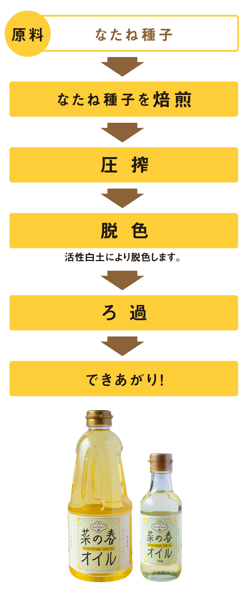 油の搾り方にもこだわり、昔ながらの圧力を加えて搾る「圧搾法」です。不純物を取り除く際も、酢と湯により油を洗う物理的な精製を行うので、添加物不使用の安心・安全な一番搾りのなたね油です。